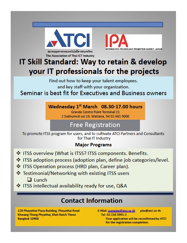สมาคมอุตสาหกรรมเทคโนโลยีสารสนเทศไทย (ATCI) ได้จัดสัมมนา เรื่อง IT Skill Standard (ITSS) เป็นระบบประเมินความสามารถ และ ทักษะความชำนาญ ของบุคคลากรด้าน IT อย่างมีระบบและมีมาตรฐาน ซึ่งเป็นประโยชน์ต่อองค์กรและการบริหารบุคลากรในหน่วยงานของท่านเป็นอย่างมาก สัมมนาจัดในวันที่ 1 มีนาคม 2560 เวลา 9.00 - 17.00 น.(ลงทะเบียน 8.30 น.) สัมมนาฟรี ไม่มีค่าใช้จ่ายใดๆ ทั้งสิ้น (รวมอาหารว่าง 2 มื้อ อาหารกลางวัน 1 มื้อ) วันที่ 2 - 3 มีนาคม 2560 เวลา 9.00 - 17.00 น. Workshop มีค่าใช้จ่าย 3,000.- บาท (รวมอาหารว่าง 2 มื่อ และ อาหารกลางวัน 1 มื้อ) ผู้สนใจกรุณาส่งใบลงทะเบียนเข้าร่วมงานได้ที่ piw@atci.or.th หรือ sumalee@atci.or.th หรือ Fax 02-216-5867 ภายในวันที่ 25 กุมภาพันธ์ 2560 สนใจสอบถามรายละเอียดเพิ่มเติม ที่ คุณอนงค์ศิริ หรือ คุณสุมาลี โทร 02-216-5991-2 ดาวน์โหลดใบสมัคร